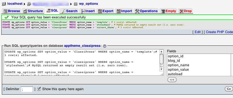 Once you’ve got your SQL code you’ll run it to change your current theme. (this example assumes you have ClassiPress already in /wp-content/themes/classipress/.