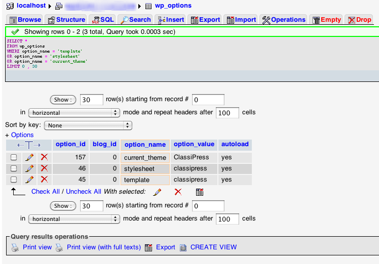 First let’s do a quick check and see what theme you currently have set. Note, this SQL assumes you have your tables named with the standard wp_ prefix. If that is not the case, you’ll need to changewp_options to whatever prefix your table structure uses.